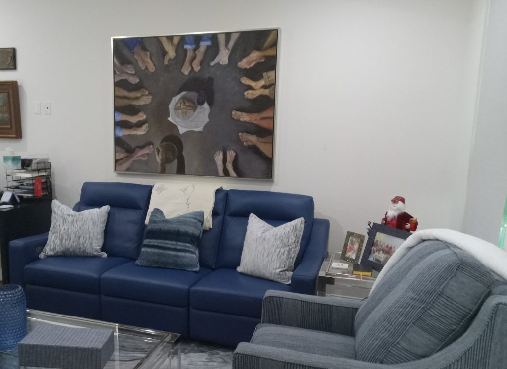 During an exhibition recently at a local Anglican church, I was asked by one of the members if I did commissions and answered “Of course”. It turned out that Stan was interested in a personalized version of the 24 Feet. He had experienced some intense challenges with alcoholism and wanted to honor his many mentors in Alcoholics Anonymous. From his perspective, they had been Jesus to him, and he was interested in a composition where Jesus was getting ready to wash their feet.